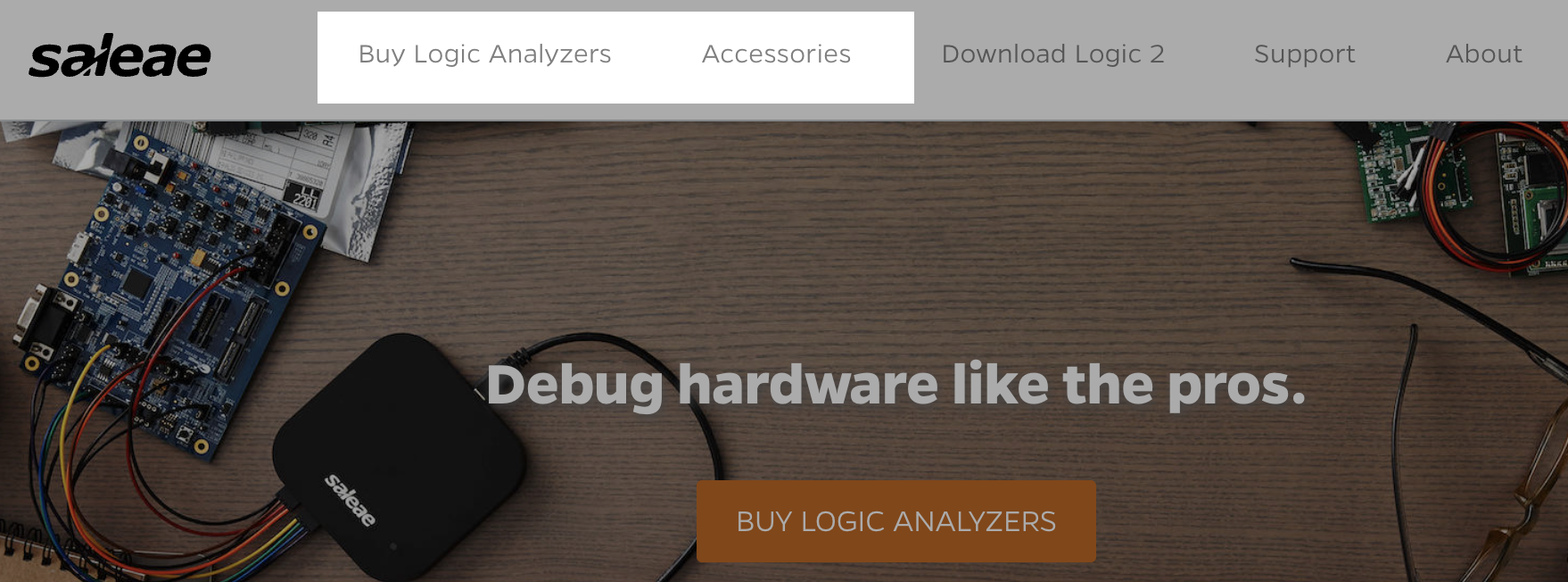 To check the stock status and lead time of a product, navigate to www.saleae.com, and click either the “Buy Logic Analyzers” button or the “Accessories” button at the top depending on the product you would like to check.