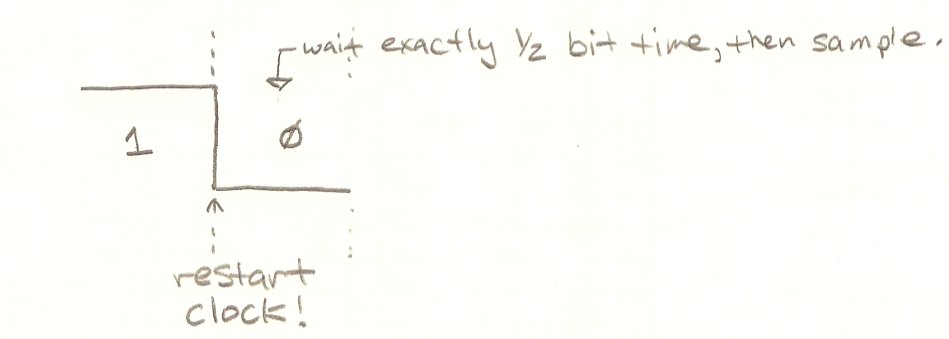 How do we know when enough time has passed that we’re now in the middle of our first actual data bit? Simple: We time it. This is how the serial port on the IBM PC did it, and it’s how a PIC or MSP430 or Arduino do it.